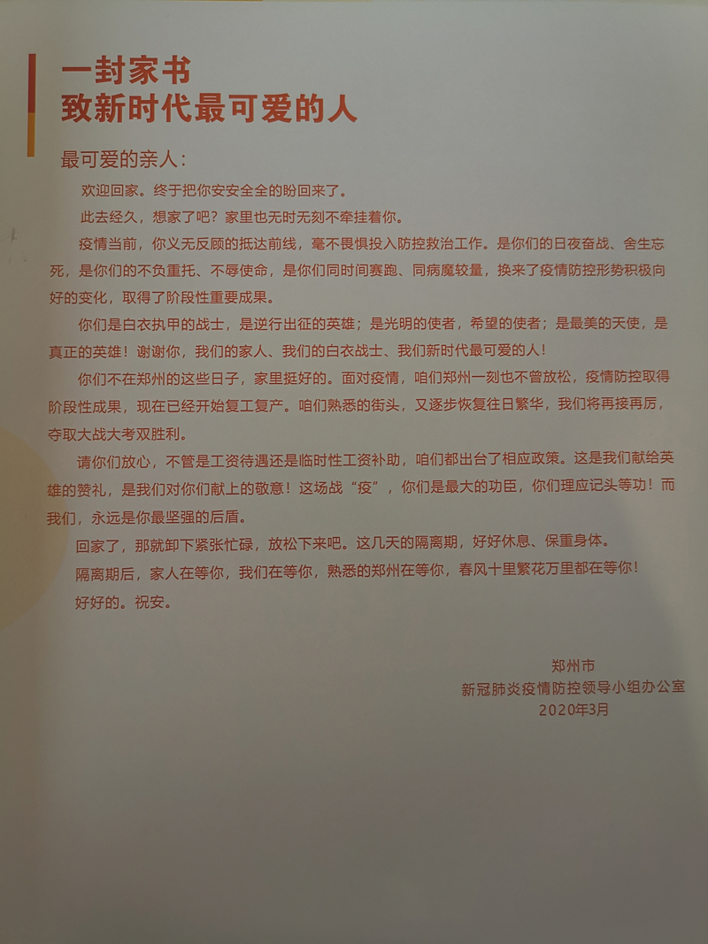 翻开服务手册,第一页就是郑州市新冠肺炎疫情防控指挥部领导小组办公室向援鄂医护人员所写的“致新时代最可爱的人”一封家书,“最可爱的亲人,欢迎回家,终于把你安安全全的盼回来了。此去经久,想家了吗?家里也无时无刻不牵挂着你……回家了,那就卸下紧张忙碌,放松下来吧。这几天的隔离期,好好休息、保重身体。”读后,让人倍感亲切,如沐春风。