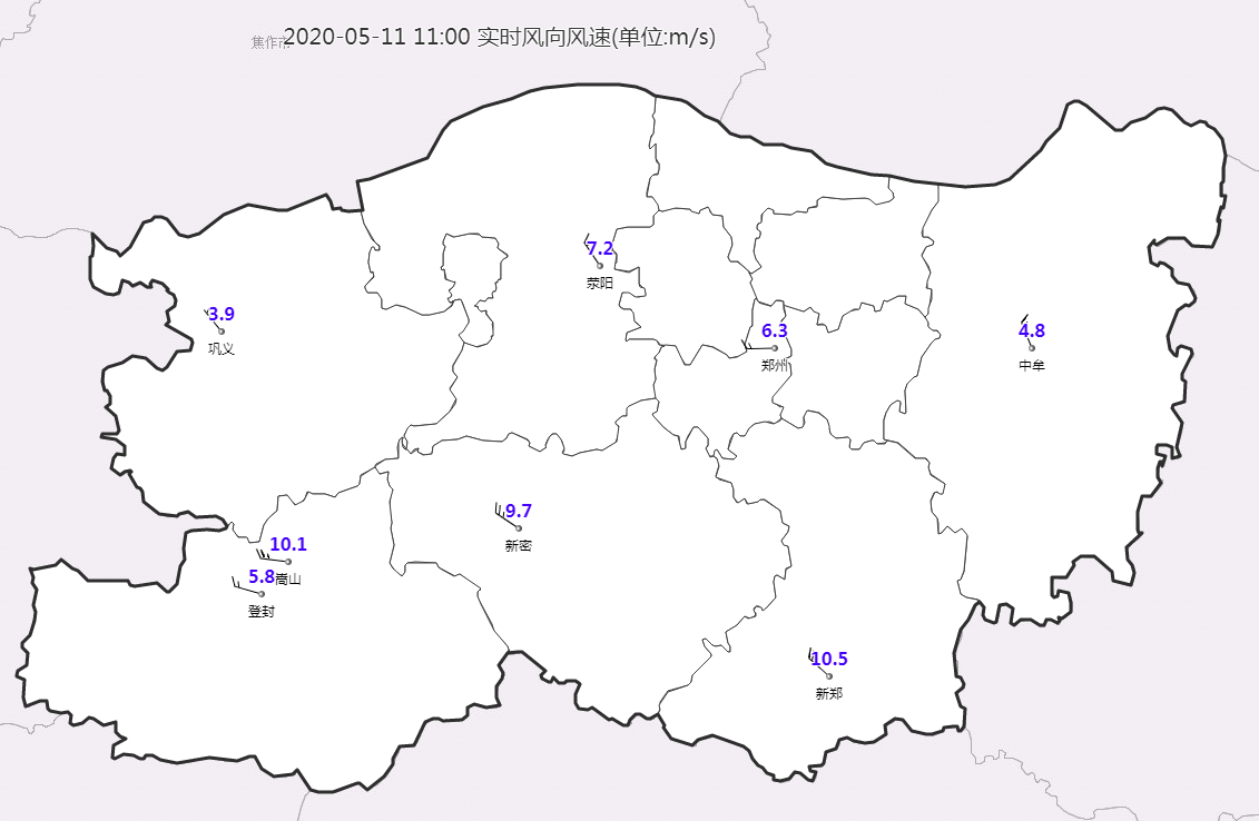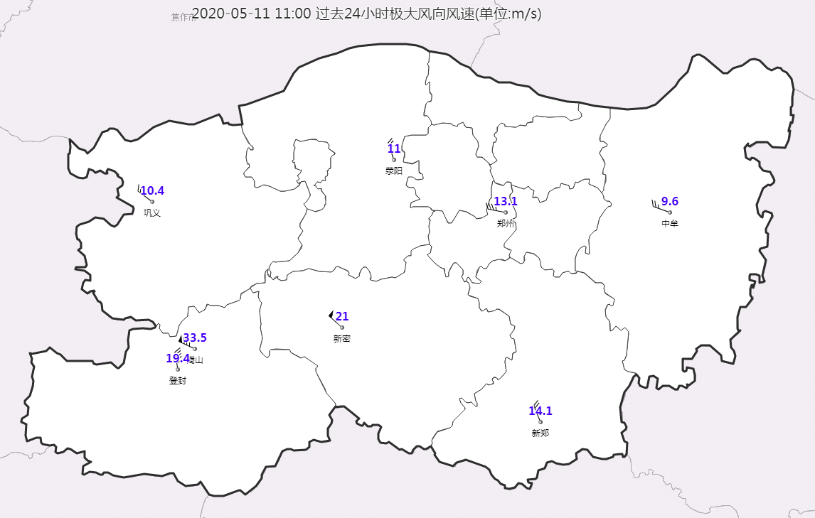 从郑州过去24小时极大风速显示图上可以看出,最大风速数值依然出现在嵩山气象站,以33.5m/s的风速遥遥领先,也就是12级飓风,陆上少有,摧毁力强大。