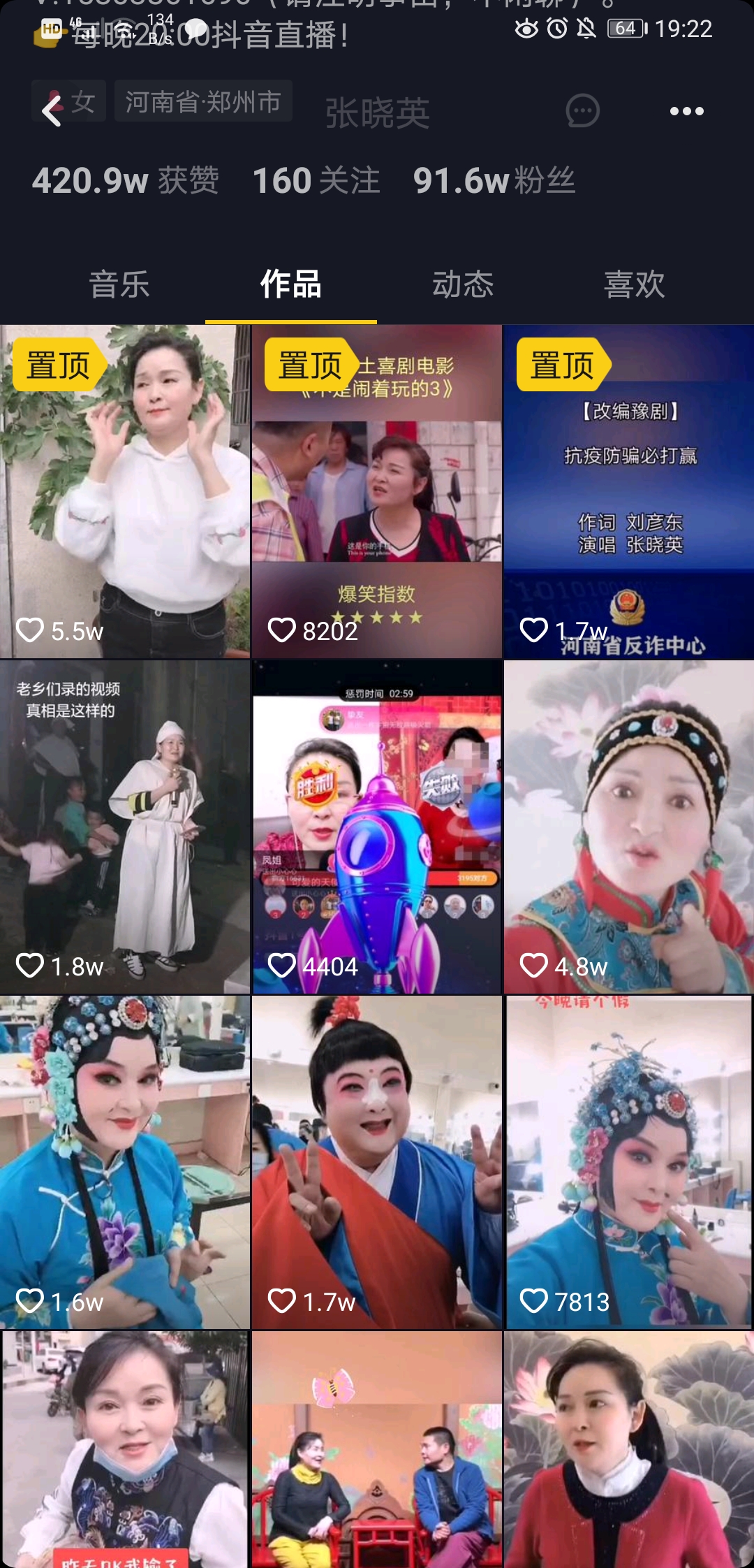 “每天抖一抖,烦恼不再有;每天播一播,大家都快乐。”打开张晓英的账号,搞笑段子、参演电影、演唱河南省反诈骗宣传歌曲、演唱经典选段,节目多样,点赞多多,由此可见,其在网络上“迅速蹿红”并不意外。张晓英告诉大河网记者,“直播已经成为我生活中的一部分了,每天晚上8点和戏迷见面,平时走路都在想说啥好玩,想段子,还得自己拍、自己做,只要观众喜欢就是我最大的收获。”