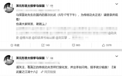 5月17日下午,千呼万唤之中,马保国终于登上了国内的擂台,这也是他在国内第一次公开比武,自然引来了众多网友关注。赛前,马保国在社交媒体上@了众多武术界人士,并写道:“马保国老先生在国内的首次比武(5月17号下午),为传统功夫正名!请观看!”