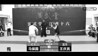 马保国起身再战,王庆民再次一招制敌,将马保国打翻。