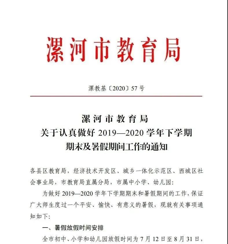 根据《河南省教育厅关于进一步规范中小学办学行为有关问题的通知》(教基〔2010〕497号)精神,结合我市实际情况,2020年暑假时间安排如下: