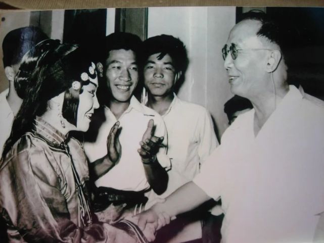 1958年,马金凤(左一)演出《窦娥冤》,并与郭沫若(右一)合影