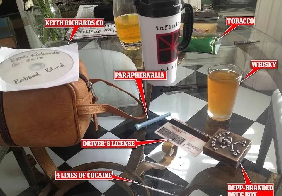 根据艾梅伯出示的照片显示,德普的桌上有吸管、一个带着骷髅头的“药盒”、四条可卡因,一张卡片,还有两杯威士忌。