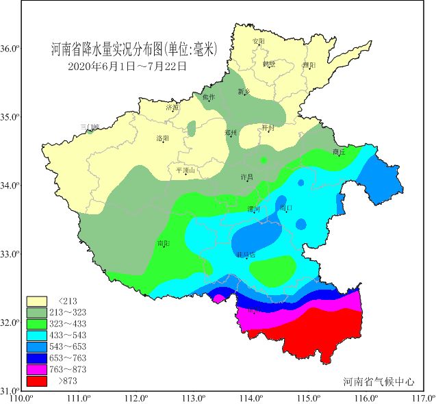 信阳各县累计降水量均已超过汛期(6—8月)降水量常年值,其中大部超过900毫米,信阳、新县、商城、潢川、固始、罗山和光山7县(市)累计降水量突破其建站以来同期最高纪录。
