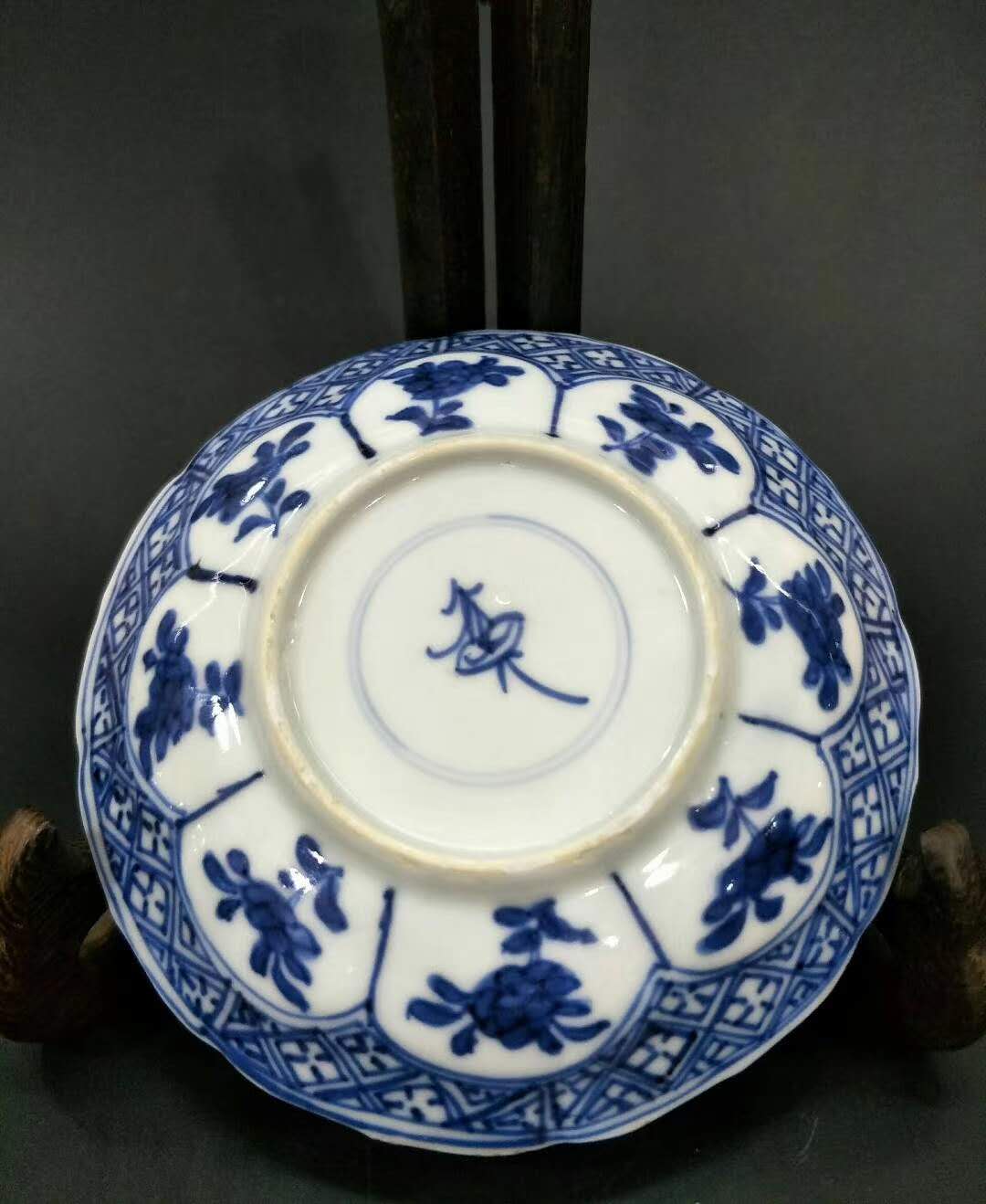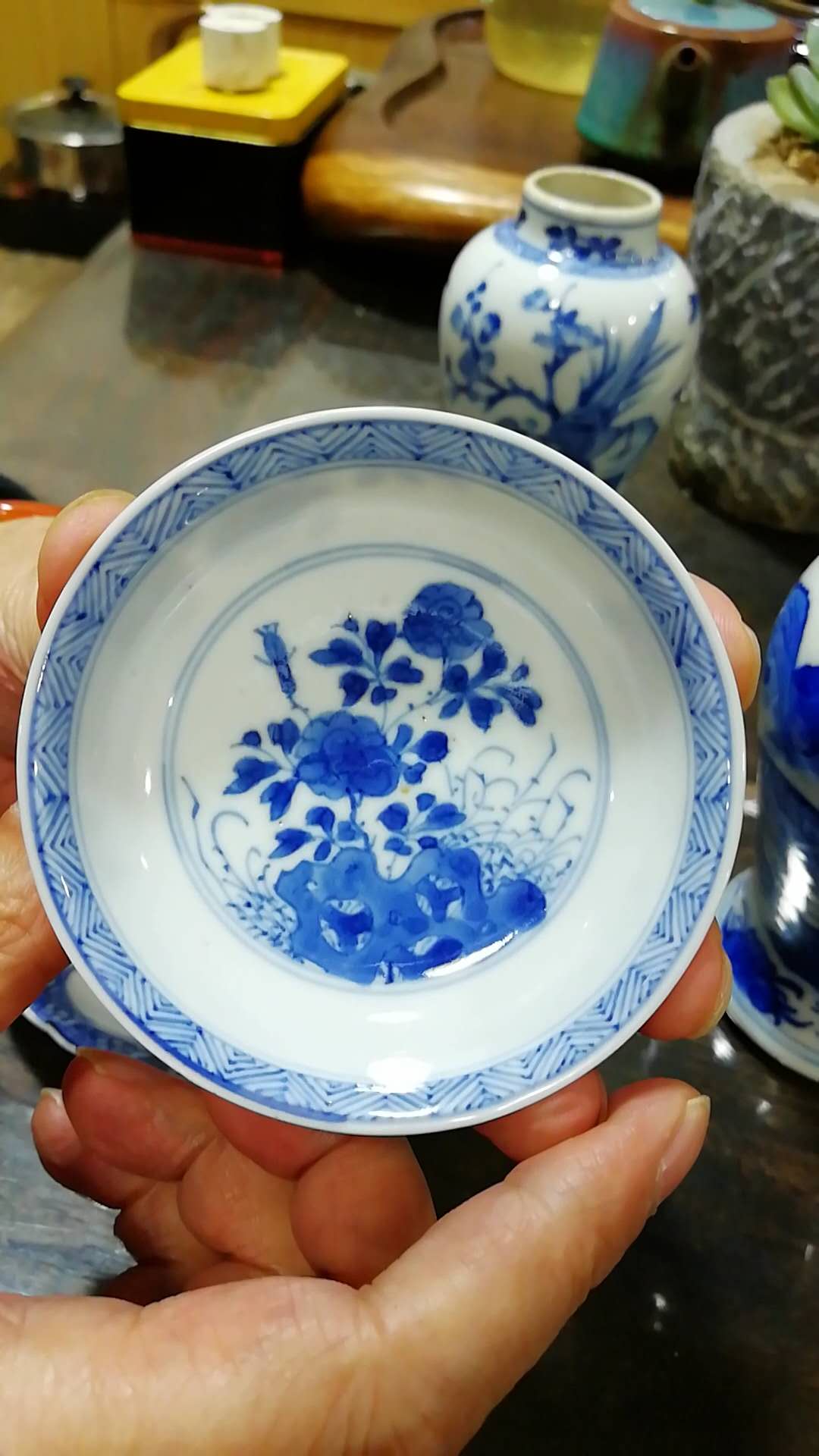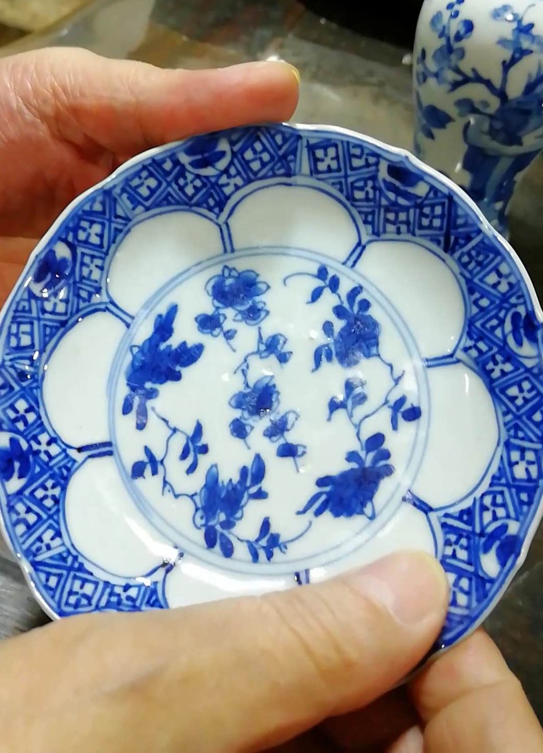 李卫国又取出两只青花小碟,非常薄,对光看透光,也是康熙年制,底款有趣,一是“花”字款,一是“鼎”字款,“这在当时也很多见。”从胎质和釉色来看,也很容易分辨。“紧皮亮釉,釉跟胎结合得很好,同时白的地方很白,晚清底子就发淡青色了。”