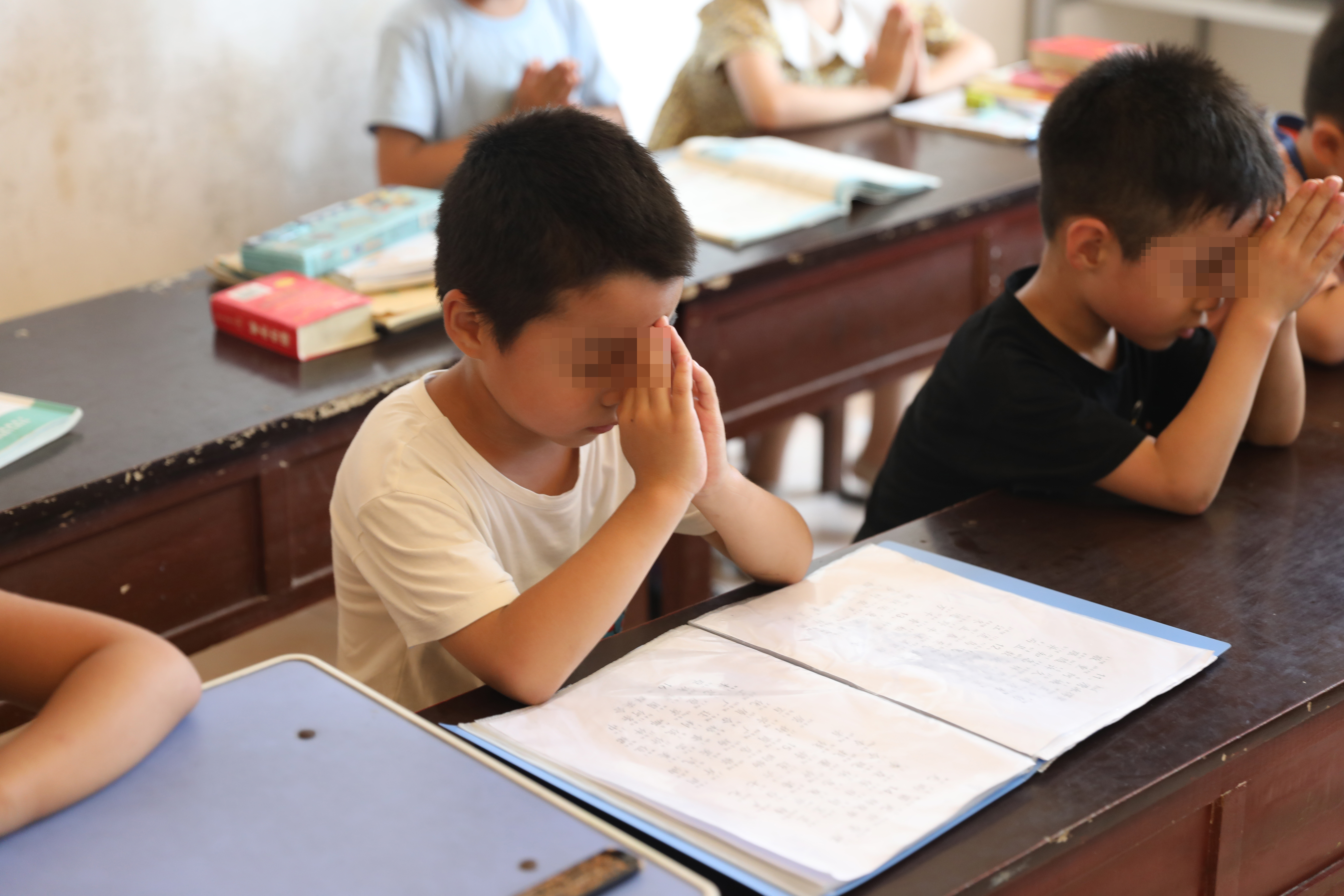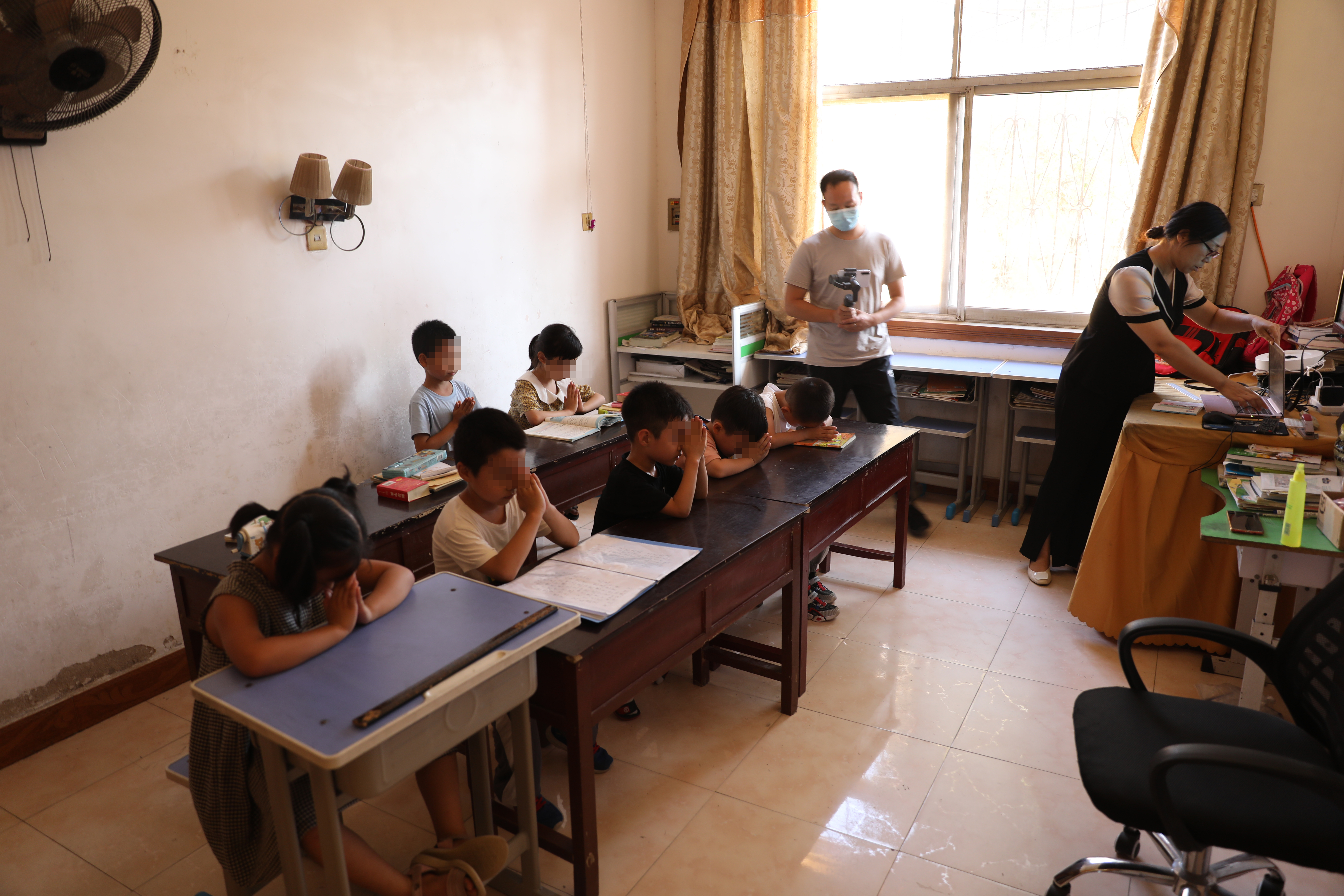 “感谢爸爸妈妈生养了我,感谢老师教育了我,我一定勤学好问,成为少年大学生,做个科学家……”随着李韩英的“开始上课了,”一楼教室里,7名不到9岁的孩子站直身体,双手合十,虔诚地朗诵着一段口号,随后坐在座位上保持双手合十的姿势闭眼“静心”。李韩英解释道:“是为了让孩子可以更快地静下心来学习。”