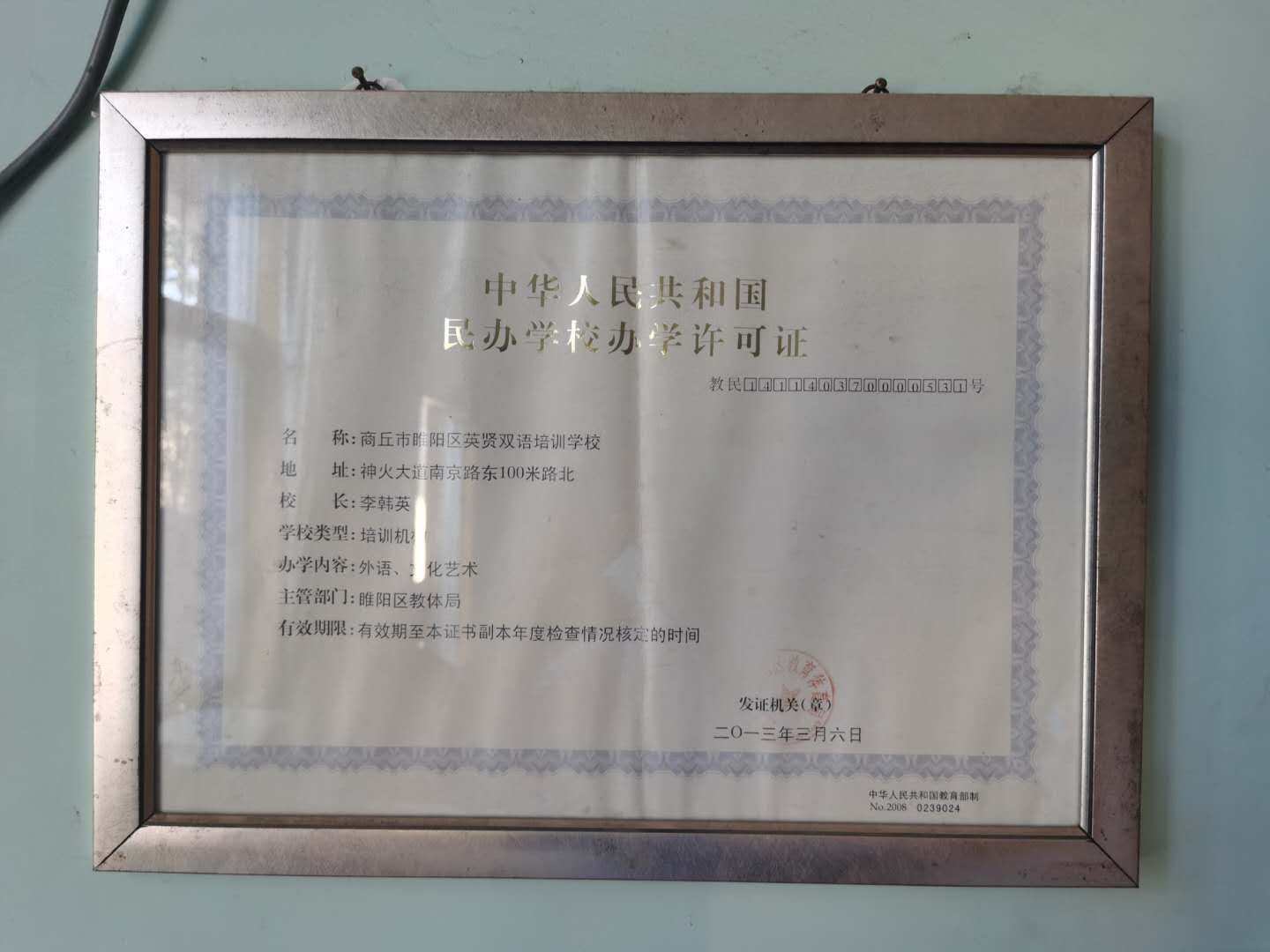 记者在这张《民办学校办学许可证》上看到,张民弢所办培训机构的名字叫“商丘市睢阳区英贤双语培训学校”,学校类型为“培训机构”,主管单位是商丘市睢阳区教体局,落款为2013年3月。