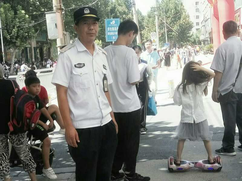 9月7日上午11时40分许,郑州市二七区建中街巡防中队庆丰分队队员王怀民和队友胡保成正在人和路小学站“爱心岗”时,看到一个小女孩儿踩着两轮电动平衡车在人群中穿梭。这时,由于小女孩没有控制好重心,重重地摔倒在地上。