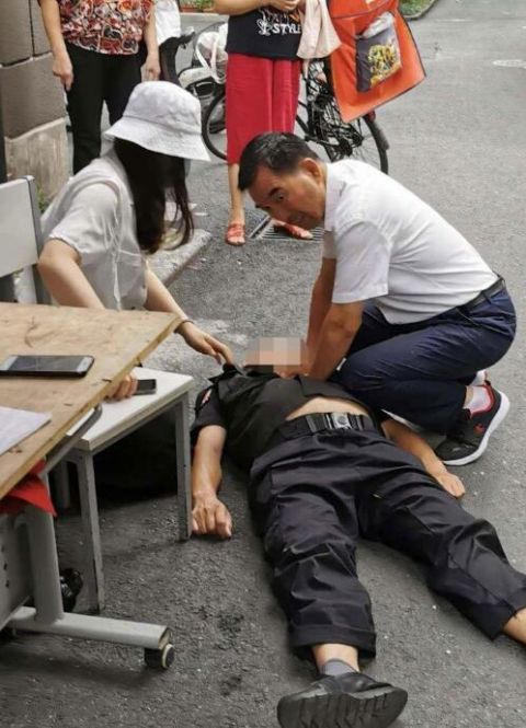 小区保安突发疾病,刚上完夜班的白衣小姑娘跪地急救,累到虚脱