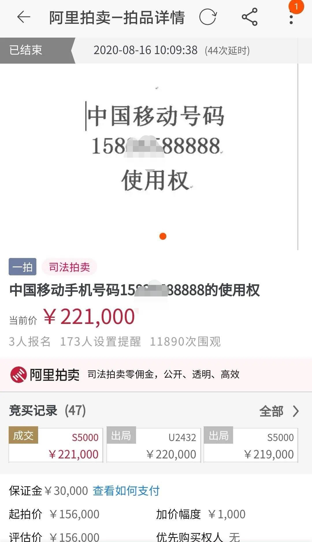 该手机号评估价是15.8万,加价幅度为1000元,三人参与竞拍。最终,经过47轮竞价,44次延时,该手机靓号使用权被竞买人以221000元成功竞得,期间,围观人数达到1万多人次。