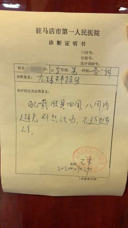 家属给记者提供的驻马店市第一人民医院诊断证明书显示,诊断意见,左踝关节扭伤。治疗经过及处理意见,“配戴肢具四周,八周内避免剧烈运动。”