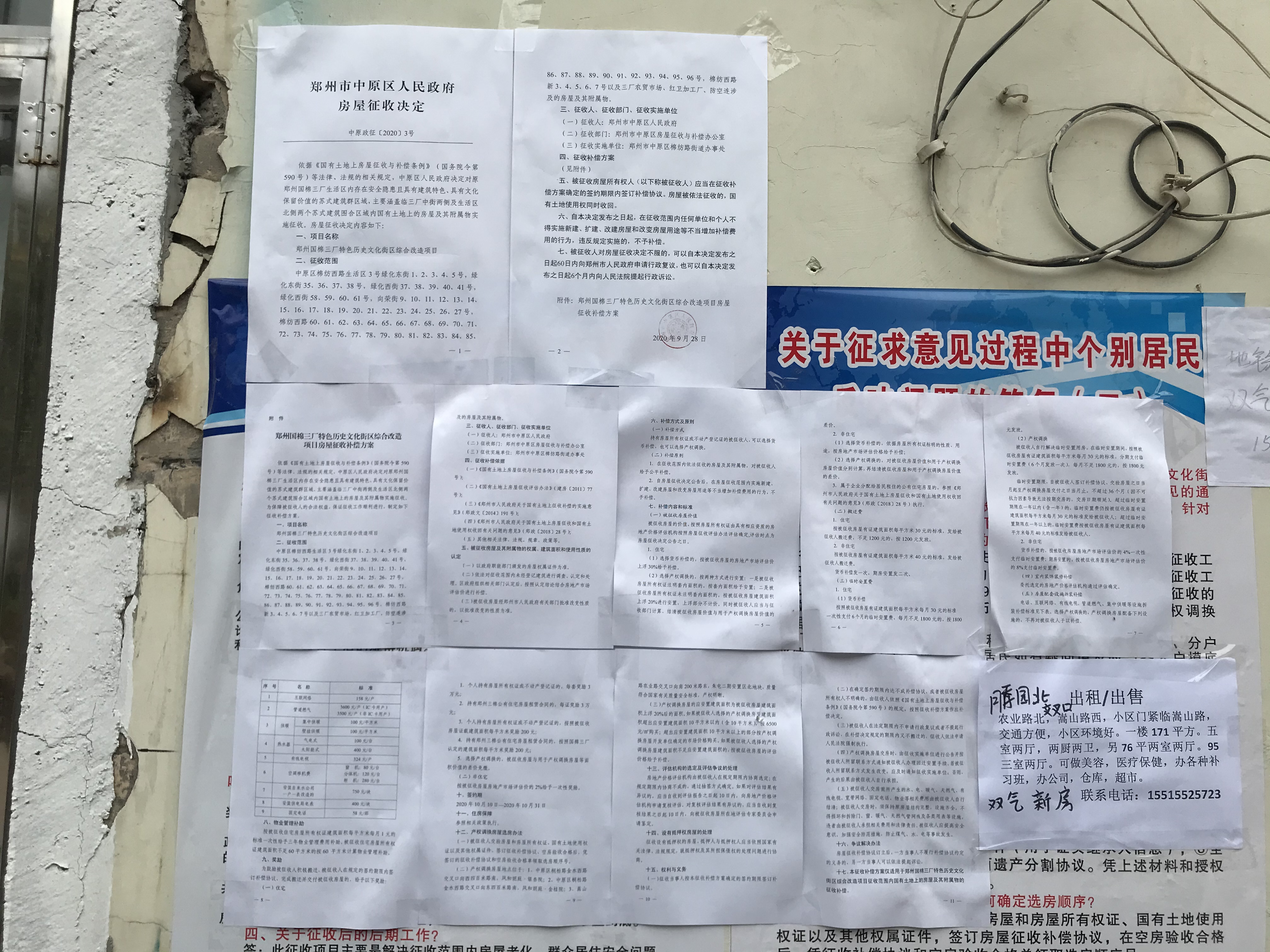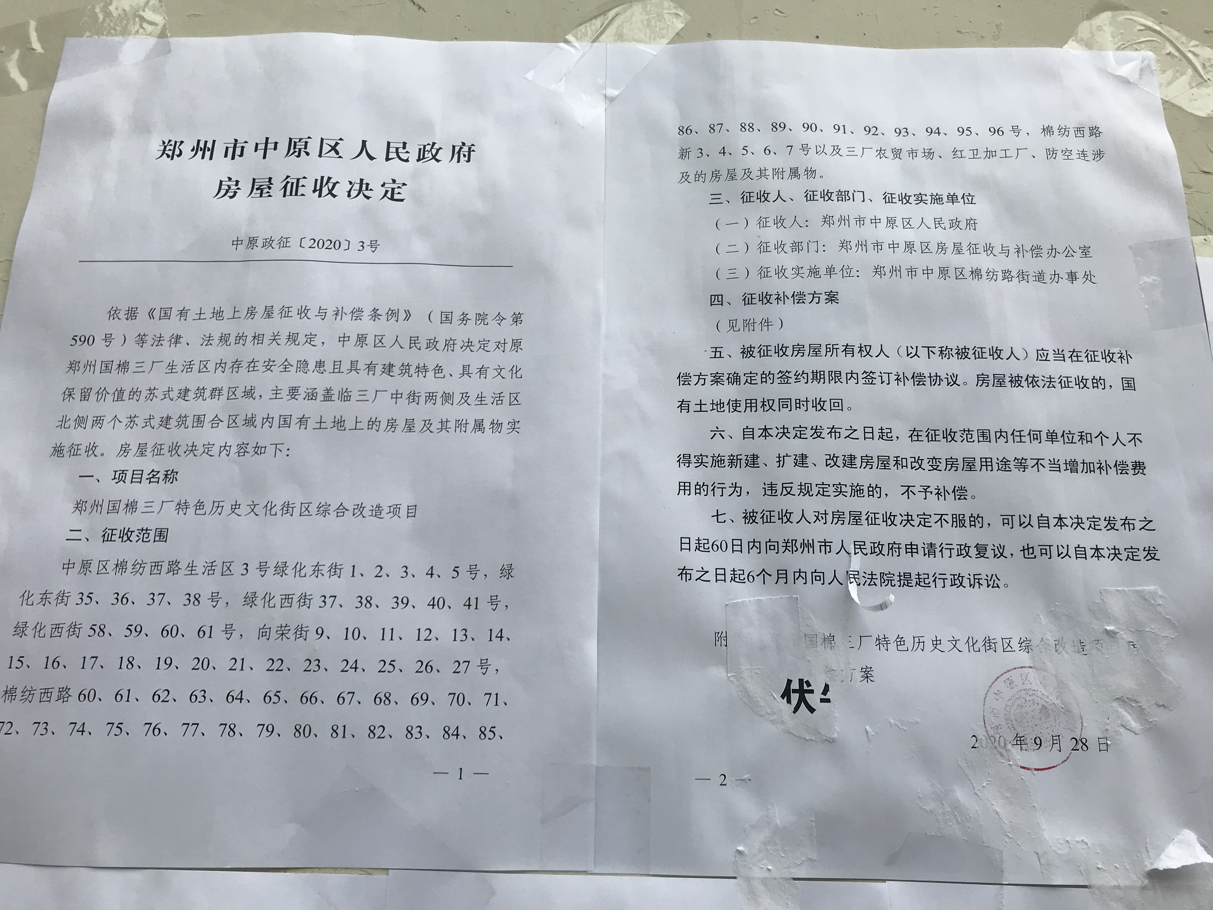 记者在国棉三厂家属区楼前,看到了国庆节前(9月28日),中原区人民政府正式下发的《郑州市中原区人民政府房屋征收决定》(下文简称《决定》),这标志着坐落于中原区繁华地段的国棉三厂这个老旧生活区,将拉开综合改造的序幕,与繁华都市的发展接轨。