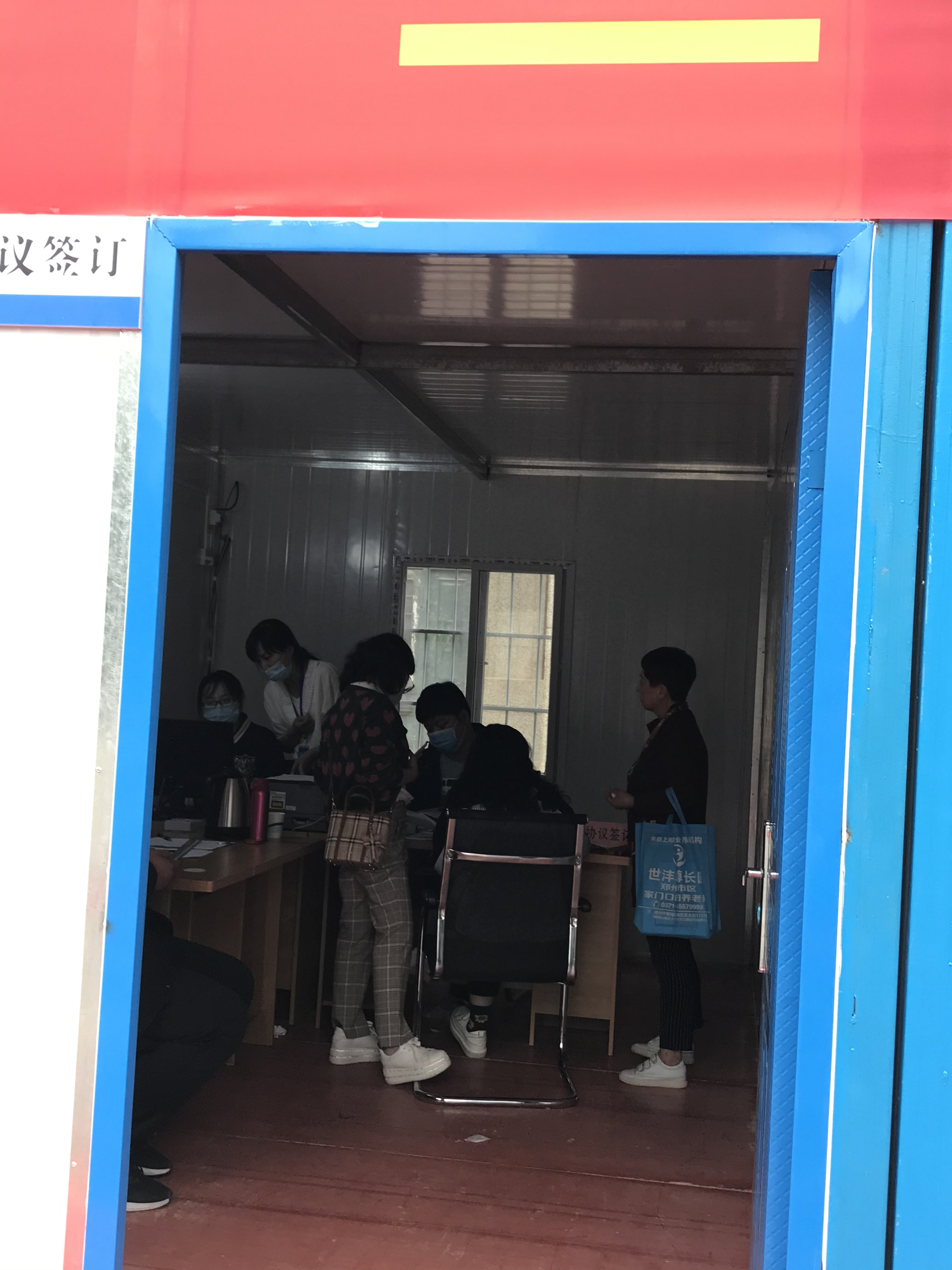 中午12时30分,记者在签订协议现场,看到有许多辖区办事处和社区的工作人员仍在维持秩序。尽管已到了午饭时间,但工作人员却没有下班,仍在为前来签协议的居民办理业务。据介绍,为了避免居民扎堆来签协议,工作人员提前进行了摸底,分批安排居民过来办理业务,因此,在第一天协议签订的现场,一切显得井然有序。