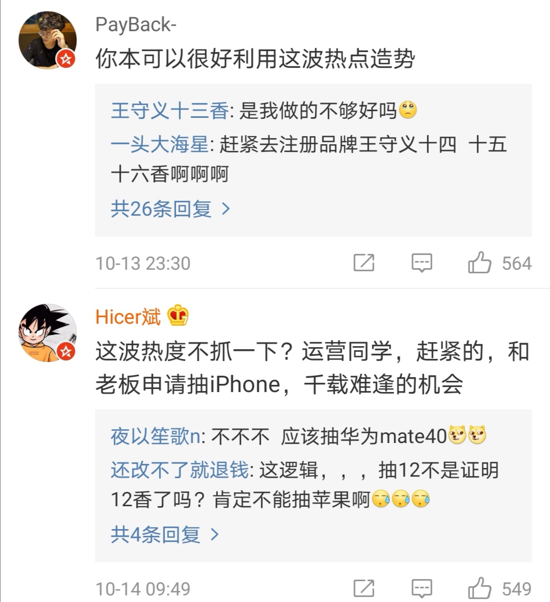 这次十三香走红,网友纷纷跑到王守义十三香官方微博下留言,催促赶紧蹭热度搞营销:“你本可以很好利用这波热点造势”,“这波热度不抓一下?运营同学,赶紧的,和老板申请抽iPhone/华为”。