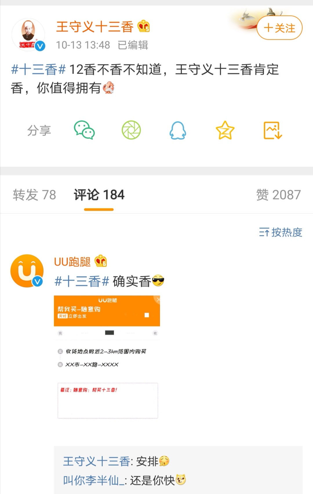 不过,王守义十三香的小编并非不懂营销,人家早早在昨天就发了条微博:12香不香不知道,王守义十三香肯定香,你值得拥有。UU跑腿也跟着蹭热度,推广自家的帮买服务:“帮买十三香。”