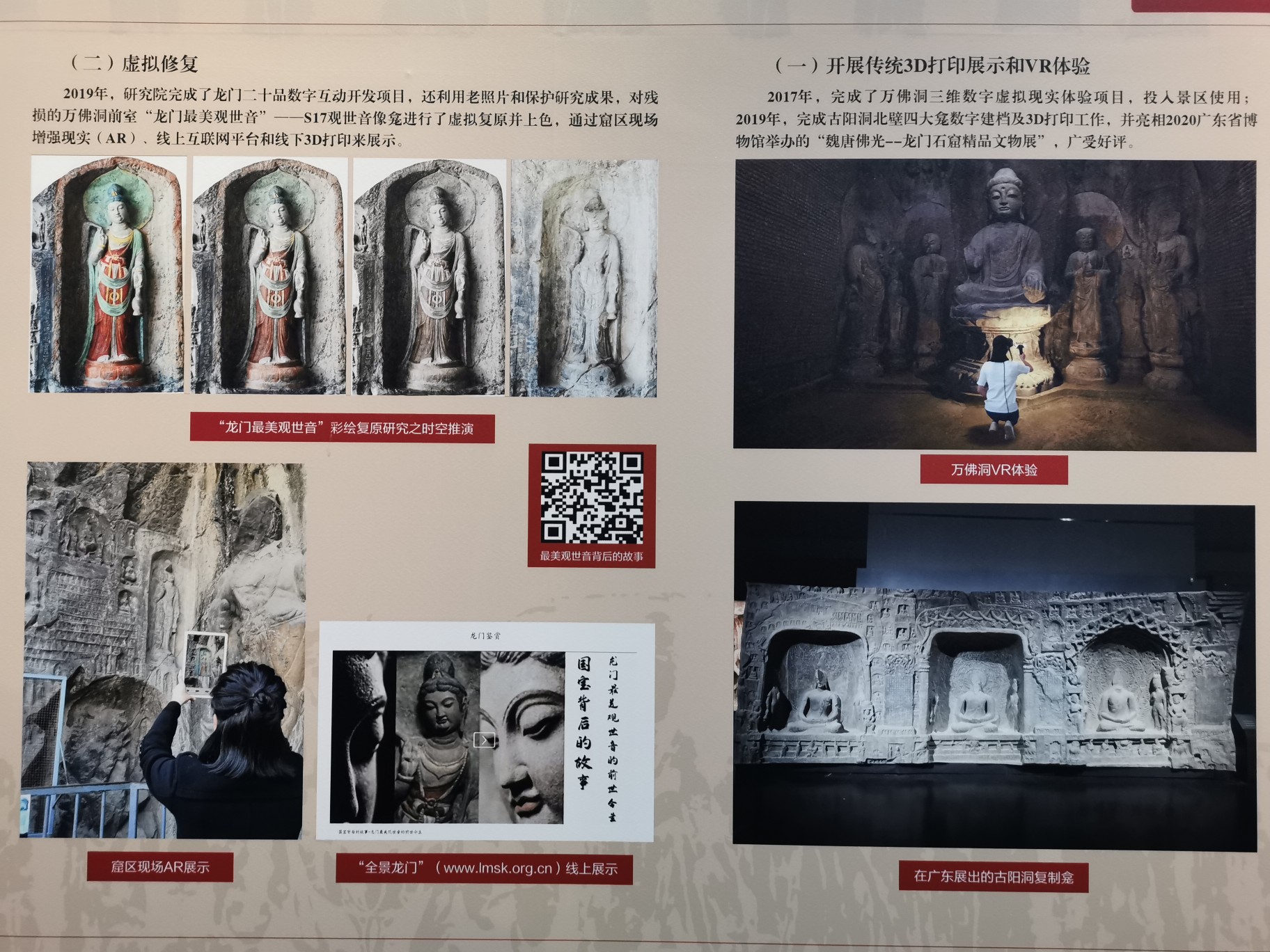 印象最深的有三个:龙门石窟“龙门最美观世音”的虚拟数字修复和彩绘复原,云冈石窟第13窟南壁7立佛龛3D打印等比例复制品,以及可以身临其境感受的敦煌三个复制洞窟。