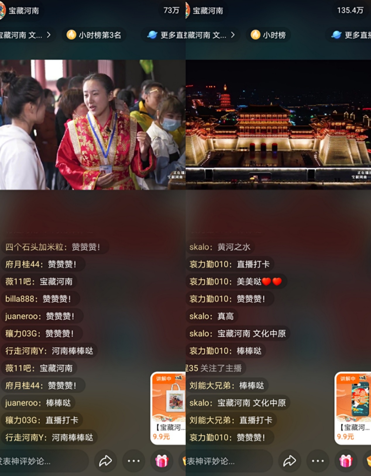 “宝藏河南”直播走过六城,联动天地之中郑州、八朝古都开封、仙养之地焦作、愚公故里济源、千年神韵洛阳以及生态宜居淅川,通过各地城市推荐官的引荐,透过镜头为全网观众带来了一场别开生面的视听盛宴。千年的文明沉淀,精湛的手艺传承,历史的遗迹再现,独特的风景展示等精彩的镜头,引起直播间观众的热烈讨论。