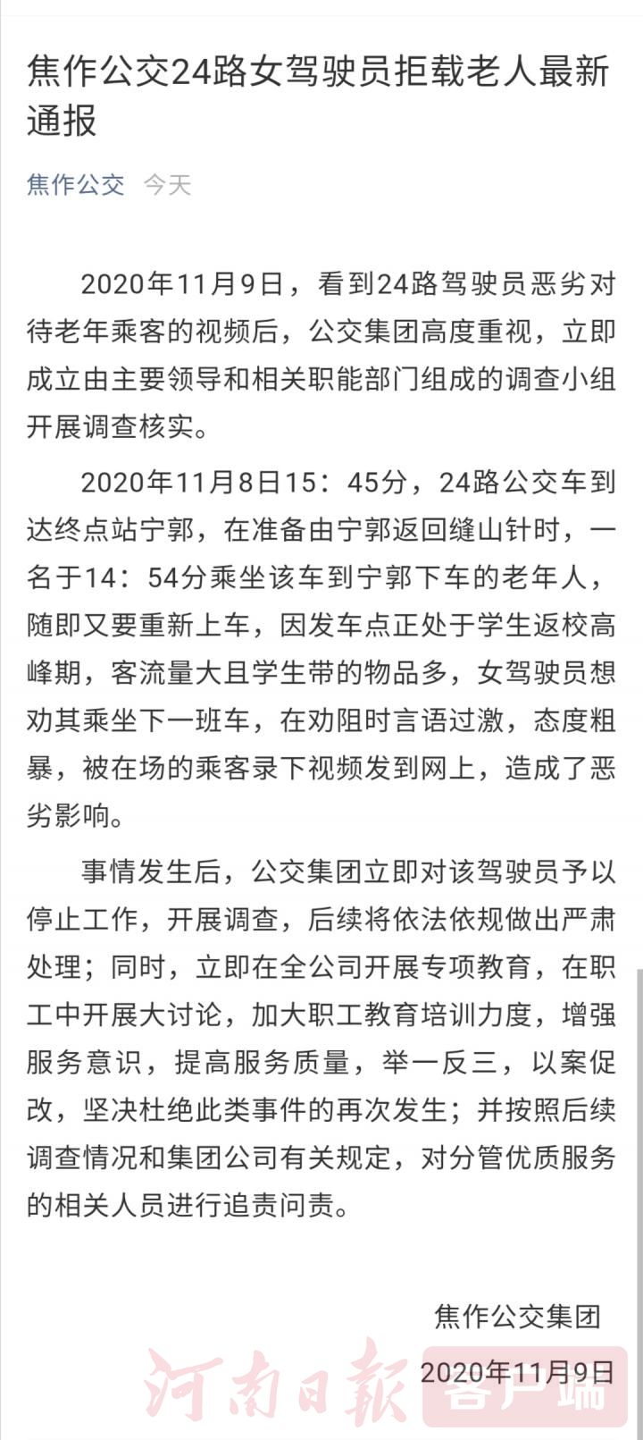 17时38分,焦作公交官方微信公众号发布《焦作公交24路女驾驶员拒载老人最新通报》: