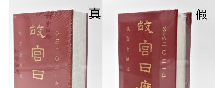 而即便是从封面来看,盗版日历为纤维布,纹路较粗,颜色偏深,较为刺眼,整体很粗糙;而正版日历封面布为棉布,纹路细腻,颜色为宫墙的暖红色,需特殊定制,是为《故宫日历》单独染色。