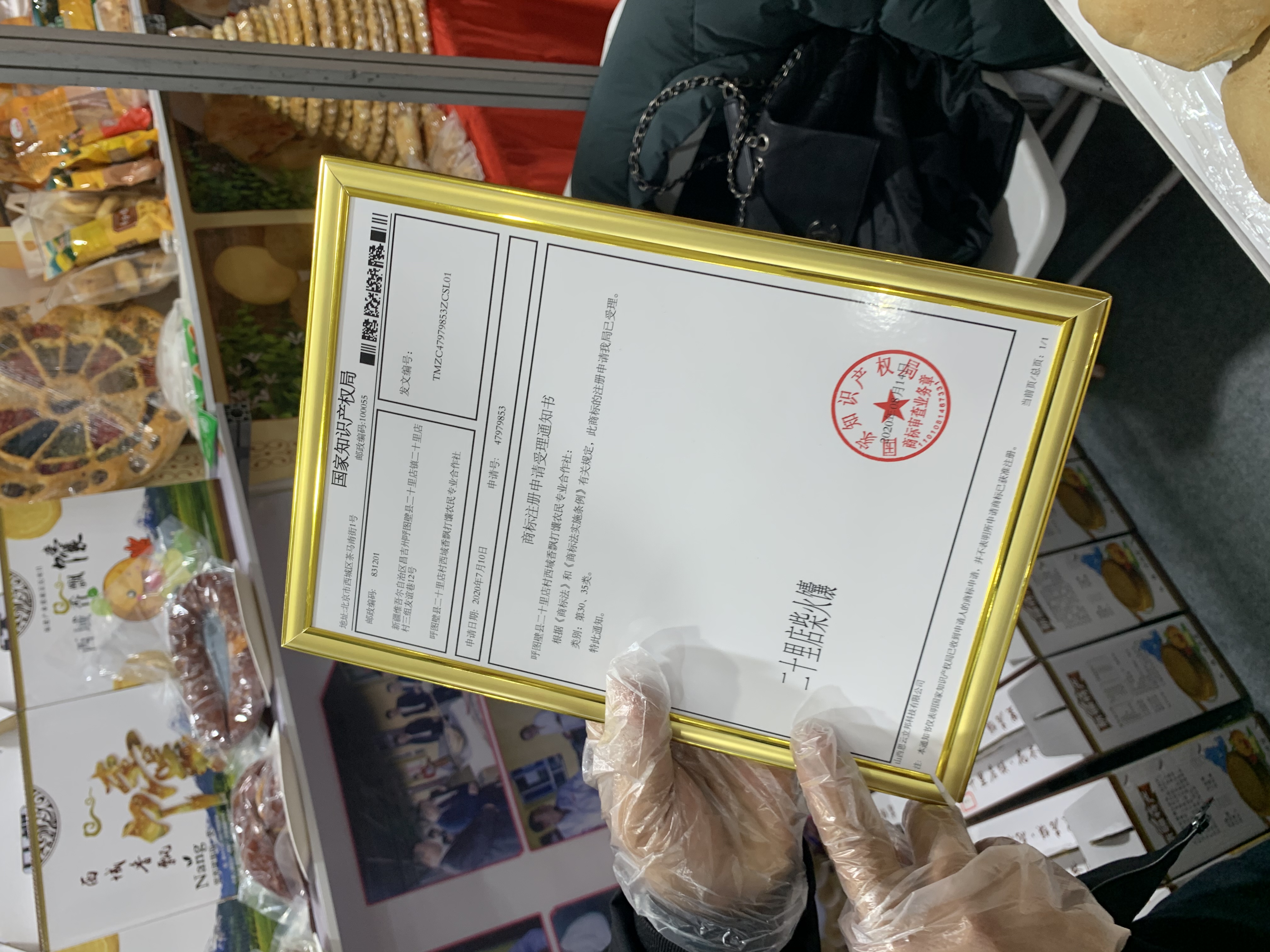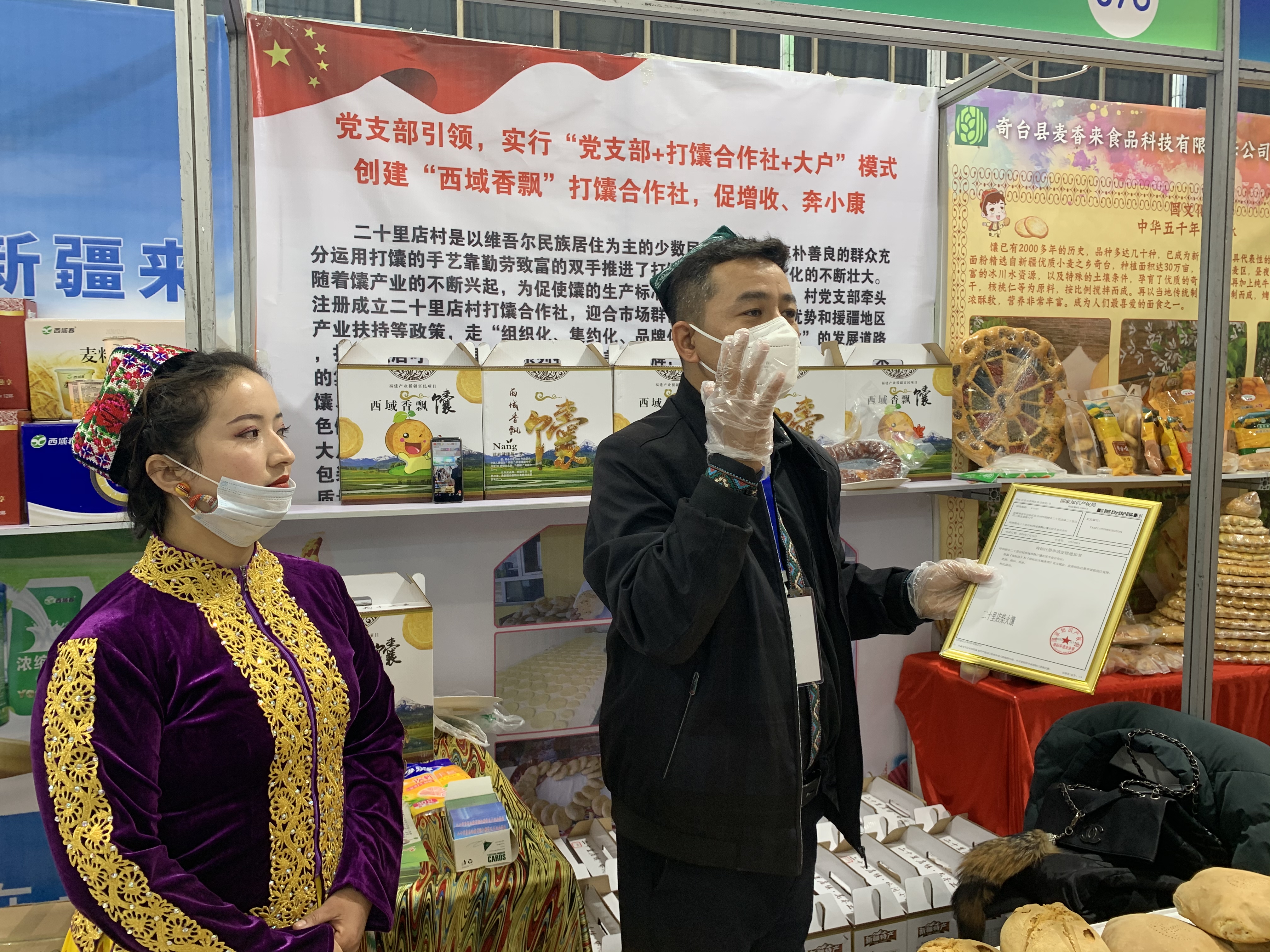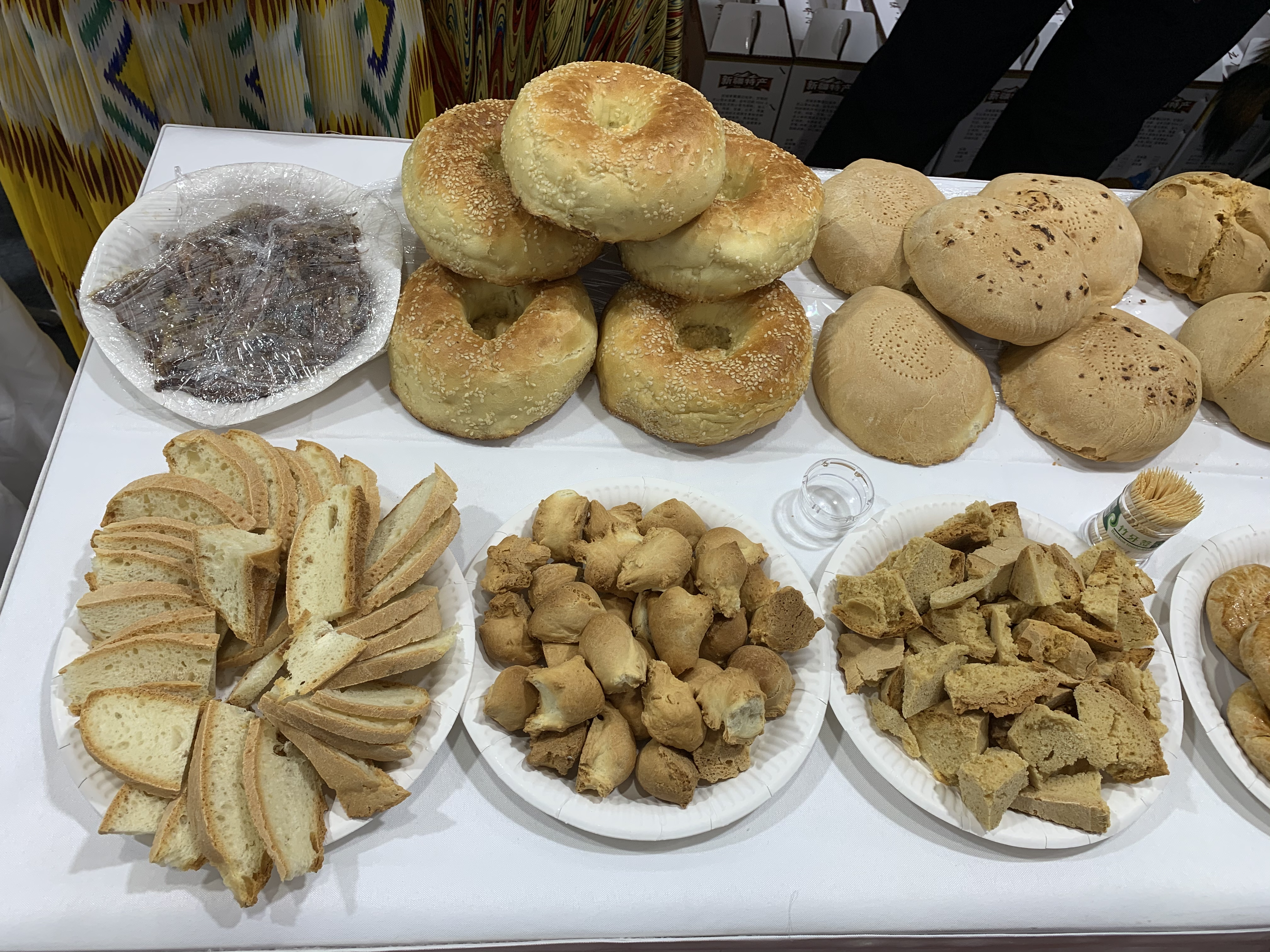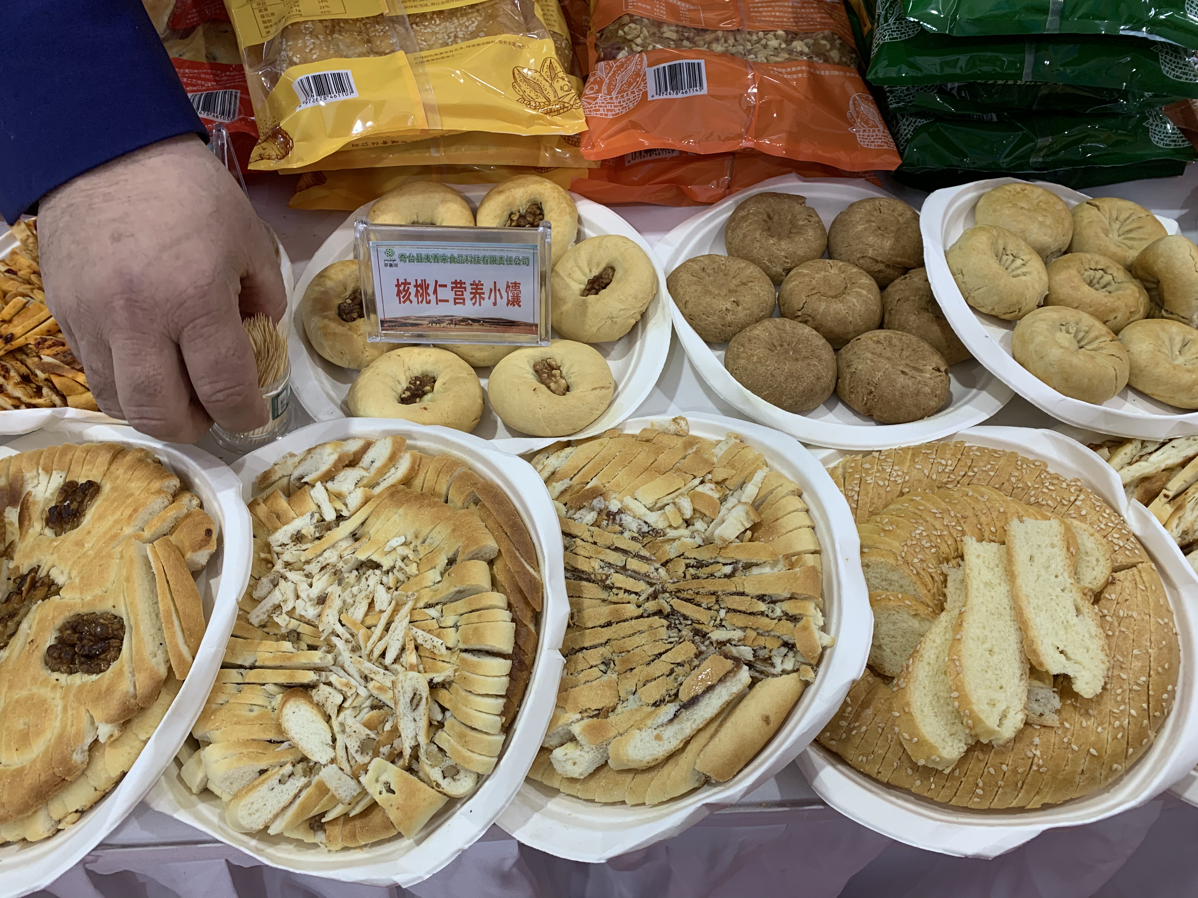来自新疆维吾尔自治区呼图壁县二十里店村的斯坦旦带着获得国家专利的二十里店柴火囊来到展区,果木柴火馕、口袋馕、芝麻囊、玉米面馕、辣子皮馕等等特色馕吸引了不少吃货围观。
