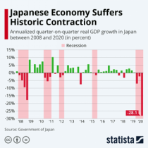 而此前,日本经济已连续三个季度下滑,第二季度按年率计算下滑28.1%,是有可比数据以来最大降幅。
