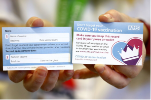 在接种第一针疫苗后,玛格丽特拿到一张卡片,提醒她大约一个月后按时接种第二针。