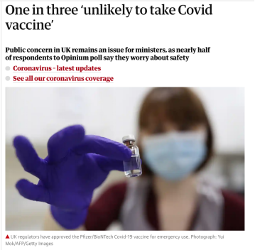 根据英国《卫报》公布的最新民调显示,近半数英国人对疫苗的安全性存有担忧,三分之一可能拒绝接种疫苗。