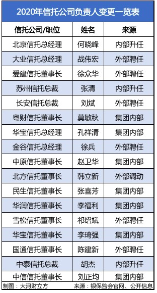 据大河报·大河财立方记者不完全统计,截至发稿,2020年已有16家信托公司的负责人发生变动。从产生渠道看,信托公司或者所在集团内部调动居多,外部聘任较少。
