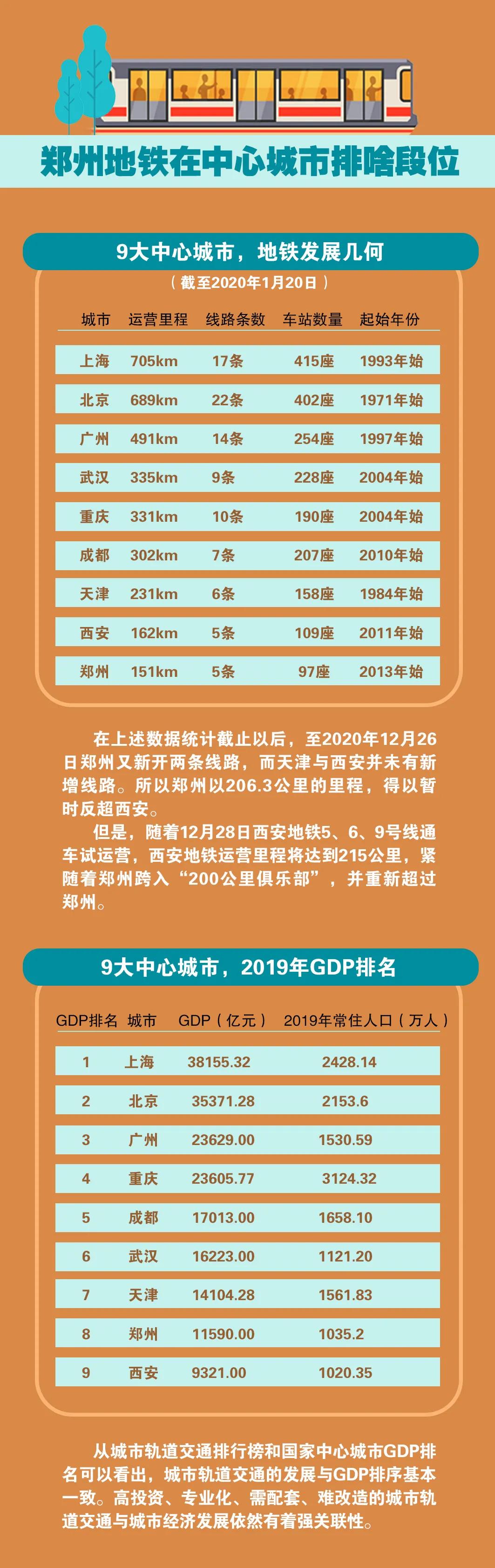 9大国家中心城市轨道交通排行,郑州要超越天津?