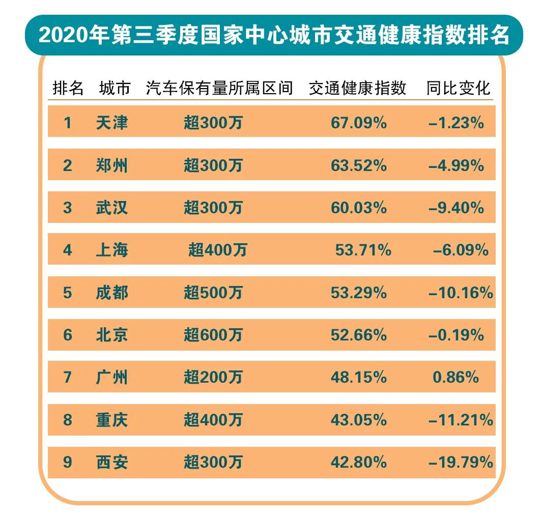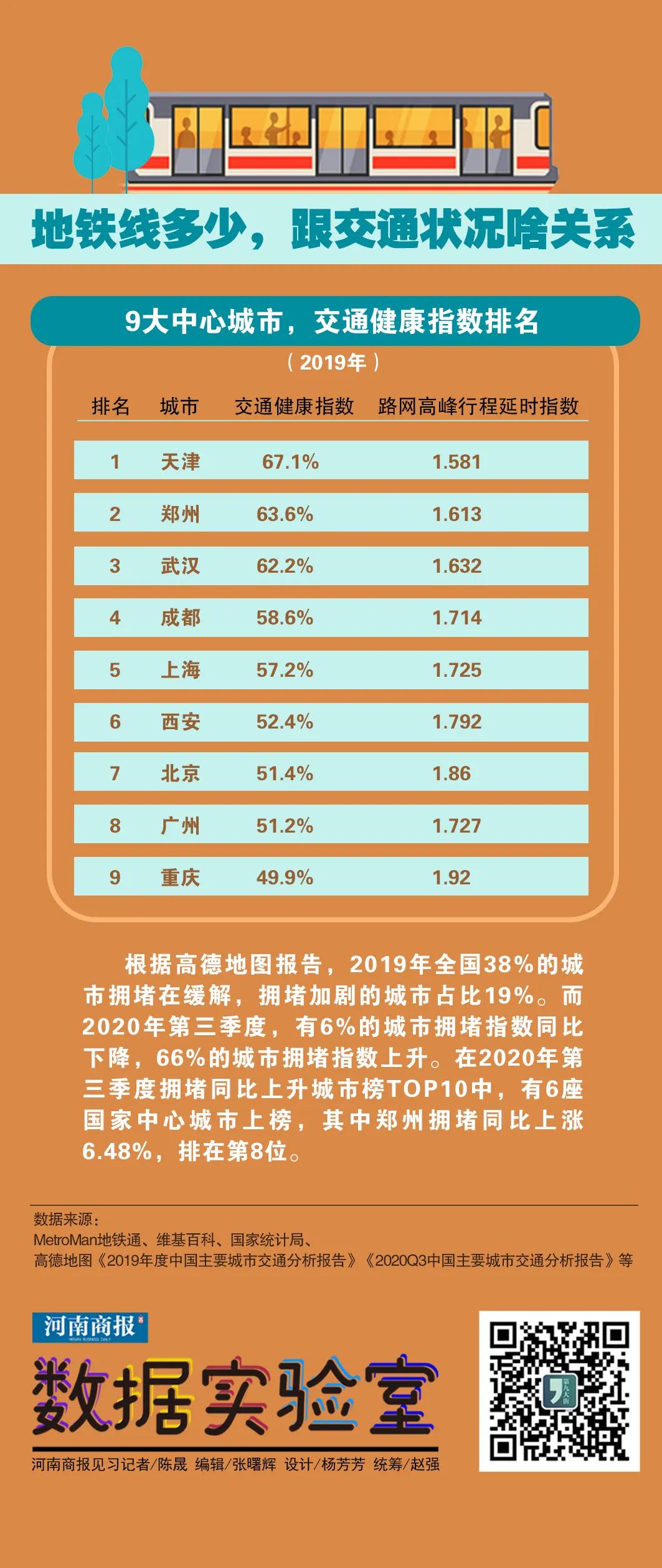 截至2020年第三季度,郑州交通健康指数与2019年持平,在9大国家中心城市中排在第2位,仅次于天津。