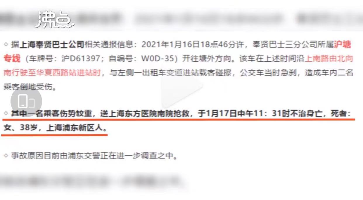 据上海奉贤巴士公司通报,涉事车辆在进站时,与左侧一出租车变道进站载客碰擦,公交车当时急刹,从而造成车内二名乘客倒地受伤。上述伤势较重的女乘客被送往上海东方医院南院抢救,于1月17日中午11:31时不治身亡,死者38岁,上海浦东新区人。事故原因目前浦东交警正在进一步调查。