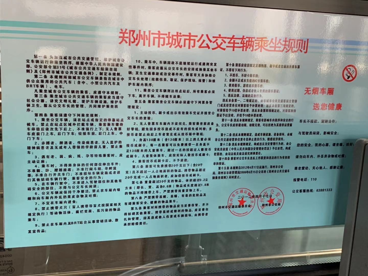 记者所乘公交车中,车前门对面车窗处均张贴有《郑州市城市公交车辆乘坐规则》,其中包括了数条乘车安全提醒。