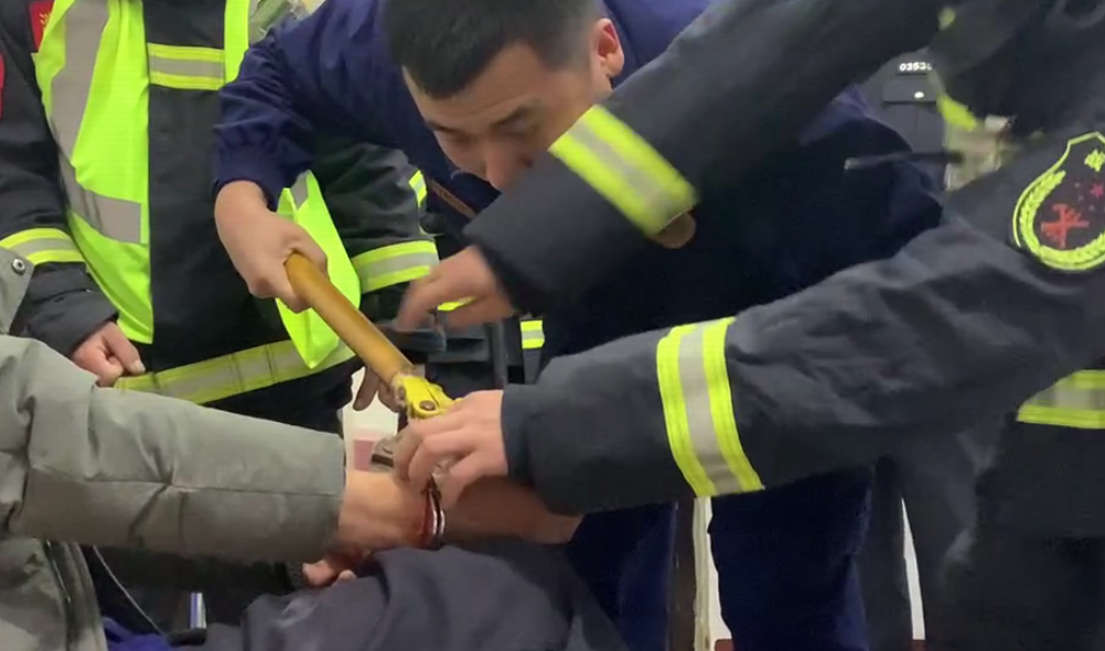 新乡市凤泉区消防救援大队接到报警后,火速赶赴现场。查看该男子的情况后,发现手铐铐的比较紧,且勒出了深深的血痕。如果不及时打开,很可能会给手腕带来更大的伤害。为了让男子尽快脱离痛苦,救援人员安抚该男子的情绪,让其放松,救援人员首先利用断电钳将手铐剪切出一个凹痕,然后再利用钢筋速拆器对手铐的关节部位剪断。