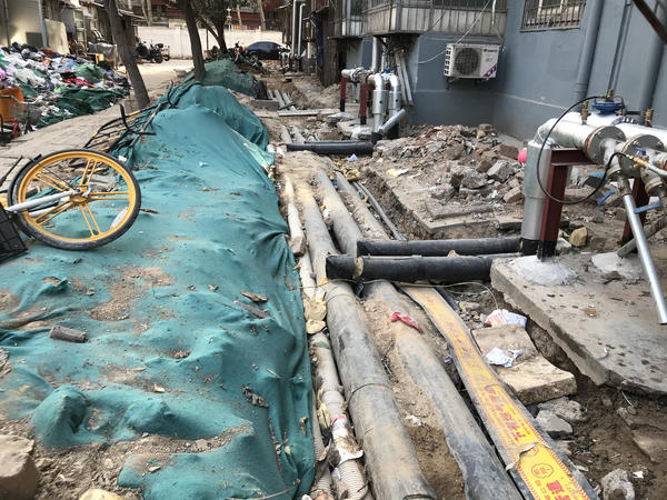 2月2日上午,记者来到了国棉四厂家属院,在位于四厂东街的10号楼和11号楼前,地面坑坑凹凹,管道裸露。西侧的过道里,是堆积如山的建筑垃圾和生活垃圾。该垃圾山长约70米,宽约5米,最高处有2米高。下面的垃圾虽被防尘网覆盖,但上面又被新堆了一层生活垃圾。据住10号楼的陈女士讲,去年下半年,该小区进行老旧小区改造时,重新铺设燃气管道。施工人员在楼前挖沟铺设管道后,不知道什么原因,一直未进行回填,使居民的车辆无法进出。