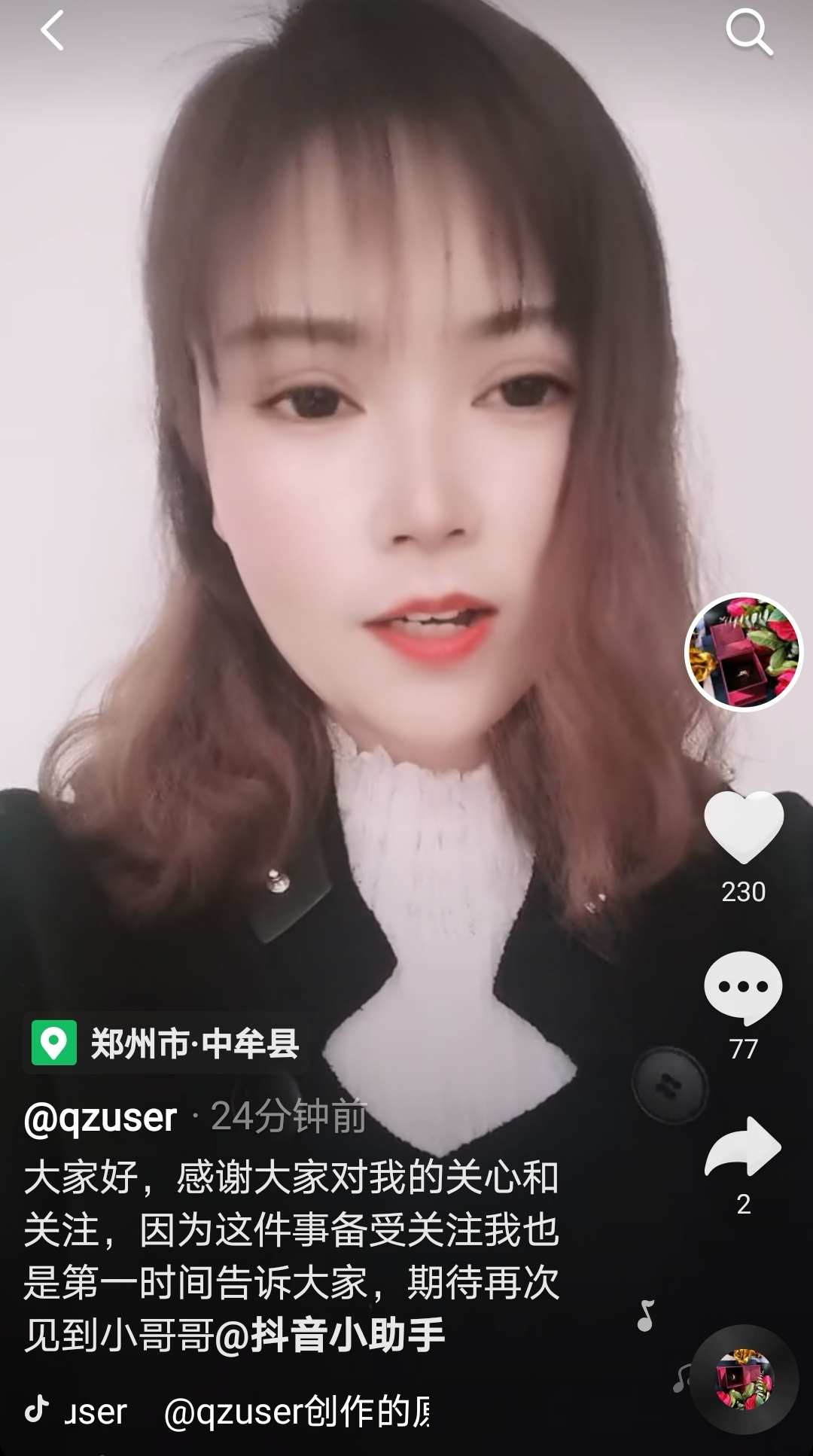 记者查阅视频发布者此前发布的多条视频内容发现,当事人曾在视频中晒出自己的离婚证,坦言离婚已多年,和“小棉袄”一起生活,此前拍摄的视频中,有生活喜乐,也有落寞伤感,她曾在视频中为自己鼓劲:试着自己去生活,试着找寻自我,加油!也曾质疑自己的婚恋观出现了问题,觉得“我在质疑所有的爱”;也曾表示,依然相信对的人会出现……她的抖音号上有这样一句话:爱可以简简单单,但不能随随便便。