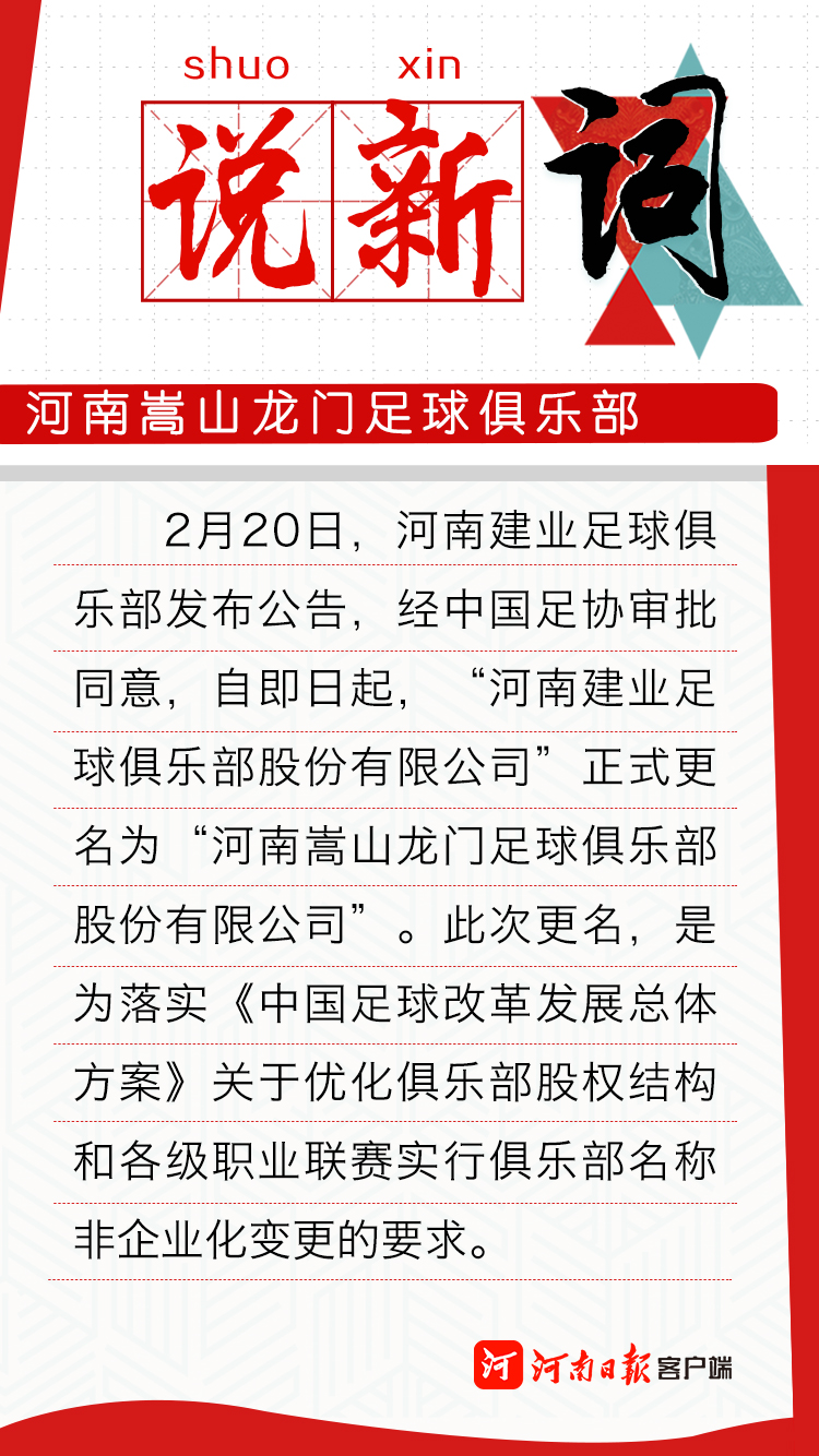 作为河南唯一的中超球队,建业会以什么样的新名字征战新赛季?2月20日,这个问题有了答案——河南嵩山龙门。