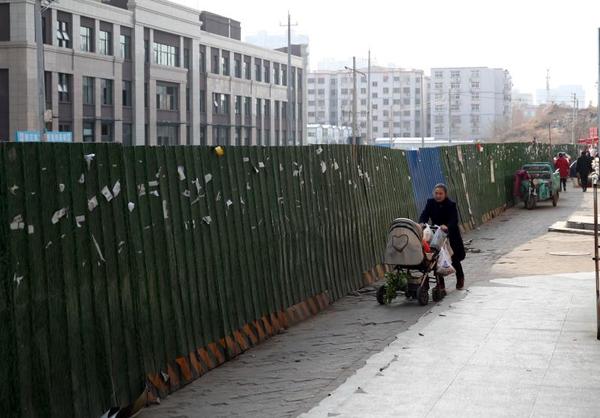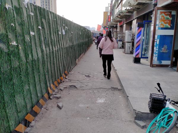 围挡正对着天伦琥珀名城小区东门,一条1米多宽的南北通道,供大家通行。路很窄,坑洼不平,有的地段还有水,进出小区居民很多,有两轮电动车经过时,大多都会小心翼翼。