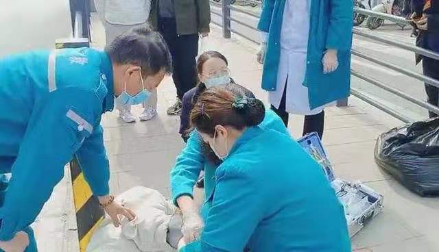 在等待120的过程中,参加过公司急救培训的站务长孙青一直小心的守在小伙儿身旁。大约4分钟后,120救护车赶到了中原路站台。孙青积极配合着120的急救人员对小伙儿进行救助。