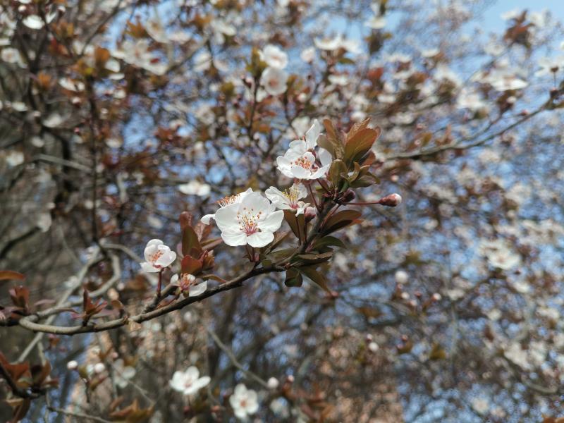 还有小小的樱花也不忘来凑个热闹,迎春街站台旁,朵朵樱花流露出芳雅的气息,娇柔的身姿,白里透红,千姿百态,灿烂芬芳。