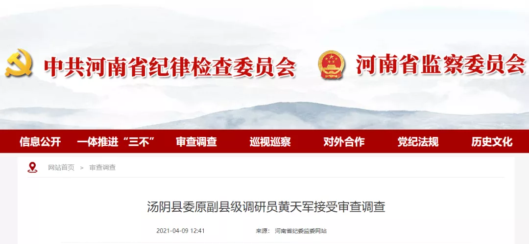 据安阳市纪委监委消息:汤阴县委原副县级调研员黄天军涉嫌严重违纪违法,目前正接受安阳市纪委监委纪律审查和监察调查。