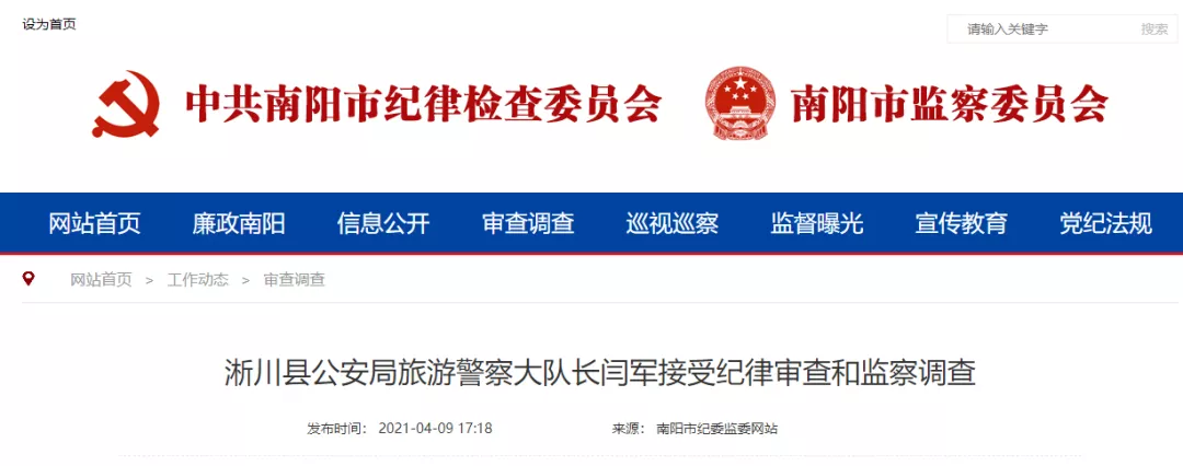 淅川县公安局旅游警察大队长闫军涉嫌严重违纪违法,已主动投案,目前正接受西峡县纪委监委纪律审查和监察调查。