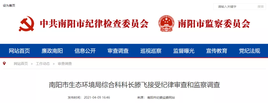 南阳市生态环境局综合科科长滕飞接受纪律审查和监察调查