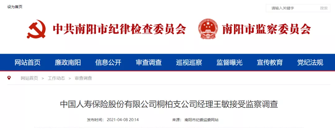中国人寿保险股份有限公司桐柏支公司经理王敏接受监察调查