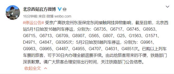 受京广高铁定州东至保定东间接触网挂异物影响,截至目前,北京西站5月1日始发16趟列车停运,分别为:G6735、G6717、G6745、G8953、G6715、G6713、G6709、G8907、G565、G807、G25、G1563、G1571、D4971、G4847、G9395次;5月2日始发8趟列车停运,分别为:G9961、G9963、G9965、G4487、G4955、G4707、G4631、G4851次。已购以上列车车票的旅客,可于30日内办理全额退票手续。由此给旅客带来的不便,铁路部门深表歉意。请广大旅客合理安排出行时间,关注铁路部门公告信息。