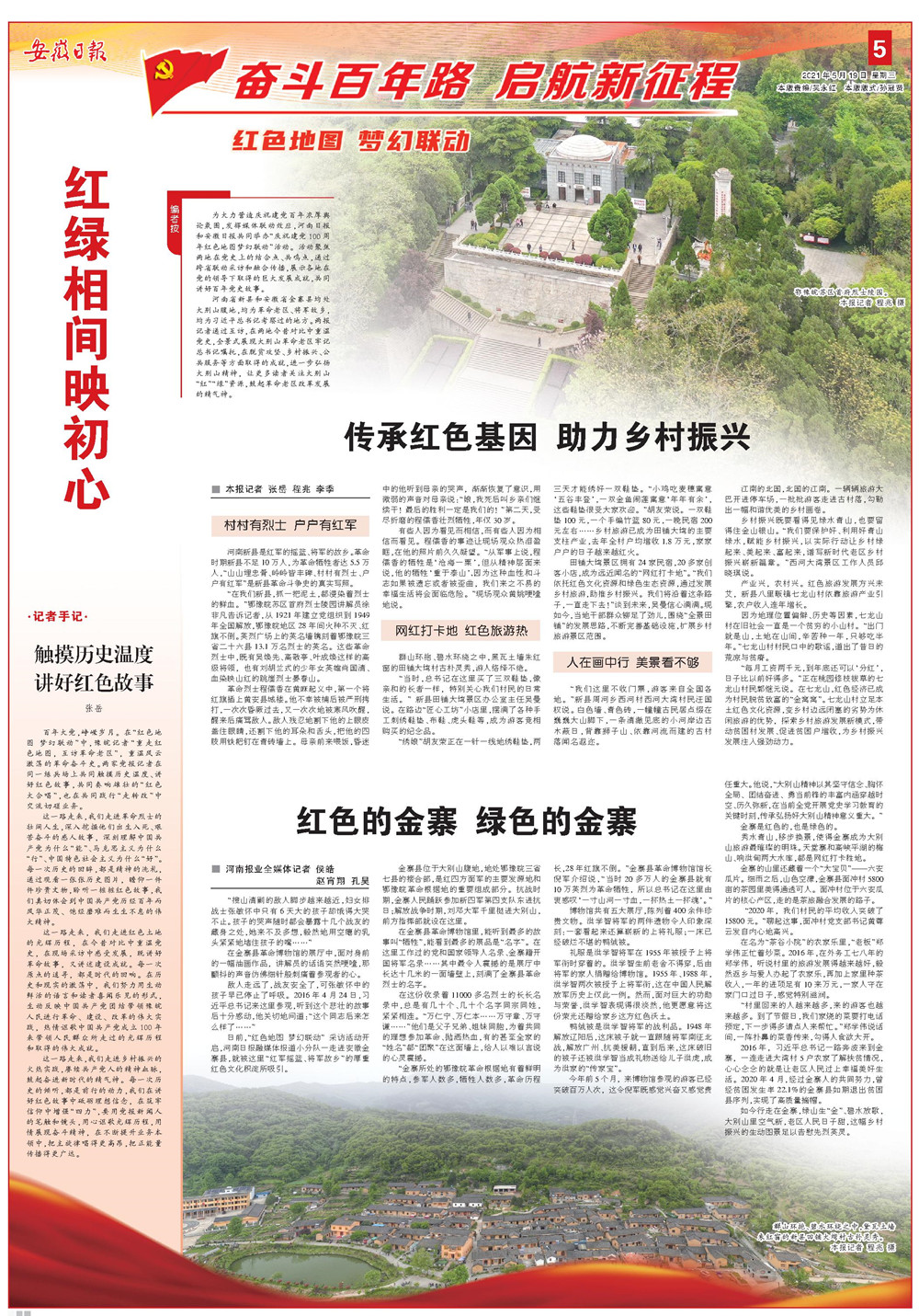 老区人民牢记嘱托,统筹用好大别山的“红”“绿”资源,把总书记的关怀转化为脱贫攻坚、乡村振兴的生动实践,日子越过越红火。在建党百年之际,河南日报和安徽日报的两支融媒报道小分队,以互访的形式走进金寨县和新县,用镜头和纸笔记录下大别山革命老区振兴发展的铿锵步伐,开启“红色地图梦幻联动”之行。