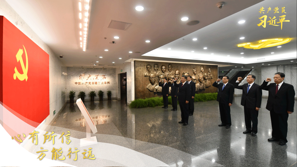 人们记得,党的十九大闭幕不久,在中共一大会址纪念馆一层序厅,面对如鲜血浸染的巨幅党旗,习近平带领其他中共中央政治局常委同志一道举起右拳,庄严宣誓: