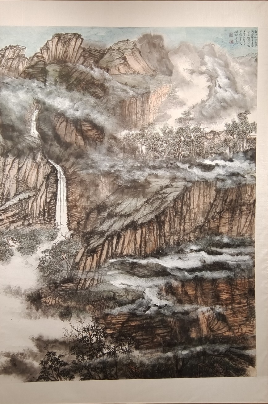 企业家魏贺君对艺术情有独钟、痴心不改,崇山峻岭、飞泉流云,题材多从家乡得来,生活气息浓厚,作品给人以浑厚大气、气势逼人的感觉。