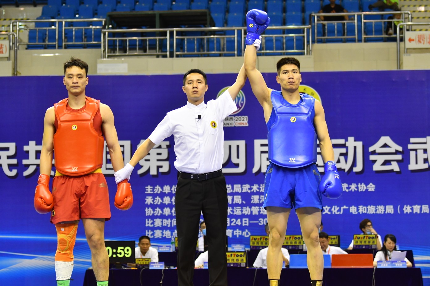 在男子团体比赛中,河南散打队、塔沟武校大级别选手、有着“功夫熊猫”之称的大块头叶翔首轮出战,重拳铁腿如暴风骤雨般轰向对手,仅用38秒就打出了13:0、16:1、13:0、16:0、11:0的大比分,裁判宣告叶翔优势获胜!