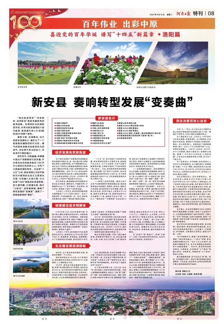 百年风华,巨轮巍巍,伴随着中国共产党铿锵前行的步履,作为革命老区的新安县在1160平方公里的红色的热土上,书写了大跨越发展的传奇。尤其是“十三五”以来,新安坚持以习近平新时代中国特色社会主义思想为引领,主动融入大势大局,大力实施“1366”县域总体发展思路,助力都市圈、打造增长极,践行“三起来”、实现新跨越,奏响了转型发展的“变奏曲”,演绎了一场脱胎换骨的“蝶变”。